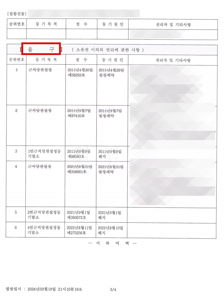 을구는 소유권 권리사항 이외의 해당 부동산의 담보, 채무사항을 알 수 있습니다. 해당 부동산을 담보로 채권이 발행되었다면 저당권, 전세권, 지상권, 지역권 등의 사항과 최고 채권액이 표시됩니다. 만약 등기부등본에 을구에 아무 내용이 없다면, 이는 부동산에 담보, 채권이 없는 상태임을 뜻하기에 좋은 매물임을 의미합니다.