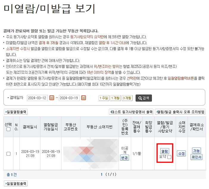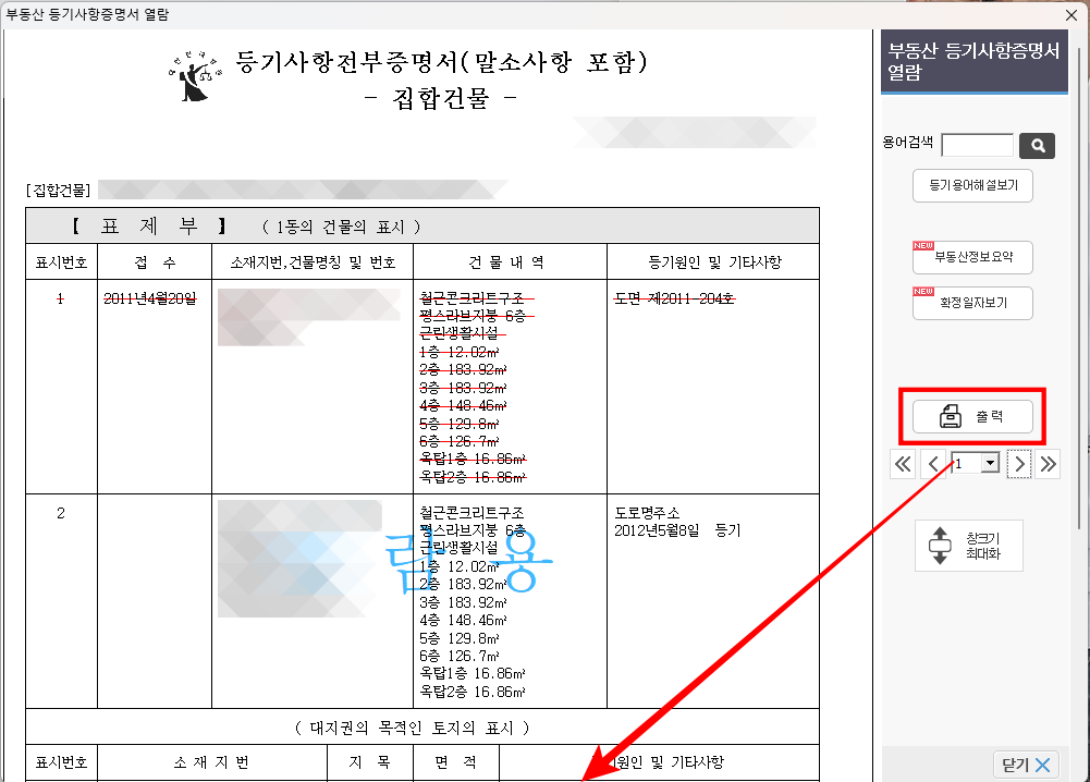 부동산 등기사항증명서 열람 창이 뜹니다. 바로 확인 가능하시고 아님 출력 눌러 출력할수도 있습니다.