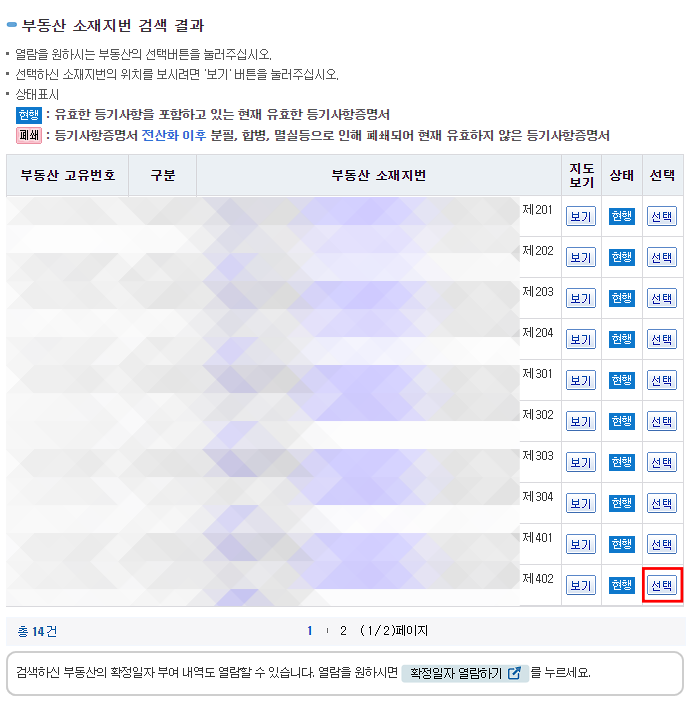입력하신 주소지가 검색됩니다. 검색된 내역에서 열람하고 싶은 동,호수 확인 후 선택합니다.