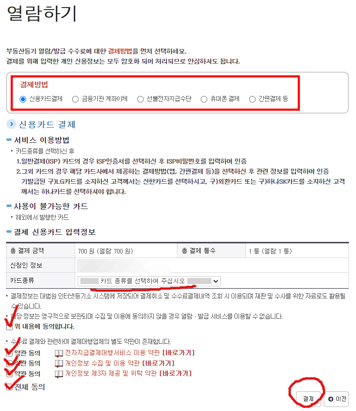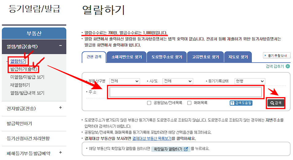 등기열람/발급 화면에서 열람할껀지 발급할껀지 선택합니다.( 열람:700원, 발급:1000원 )