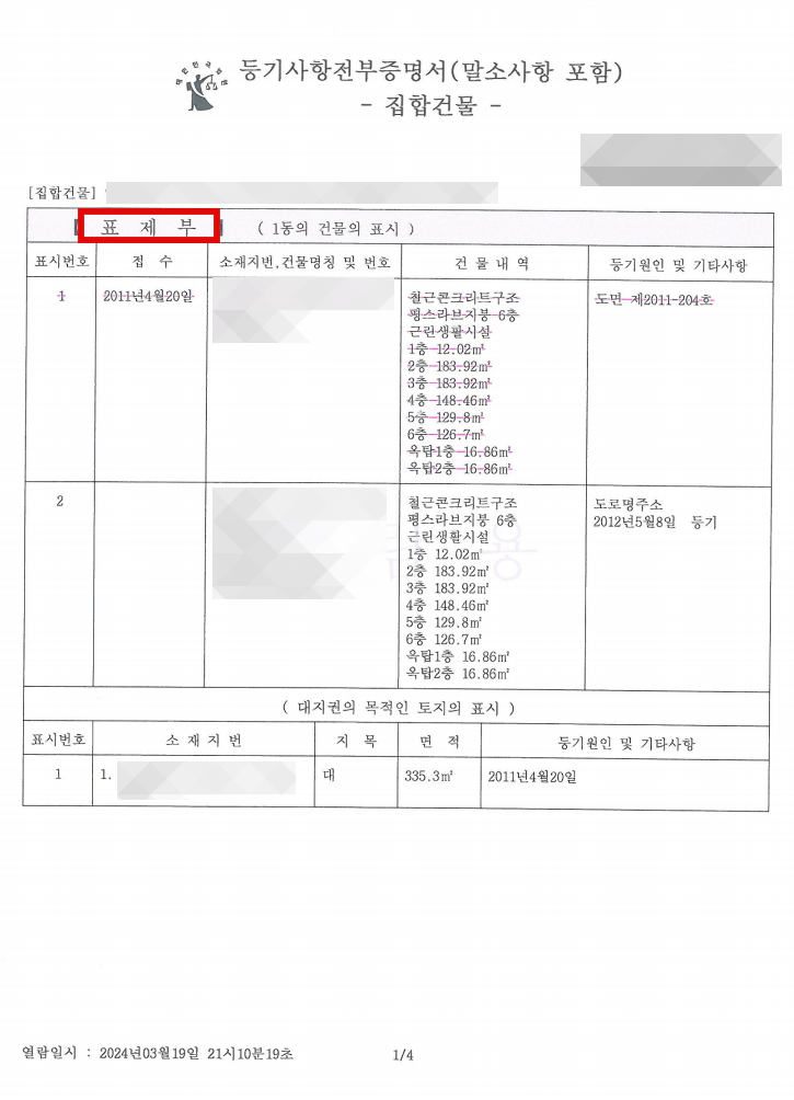 표제부 : 해당 부동산의 위치, 면적, 대지면적 등 가장 기본적인 정보를 제공.