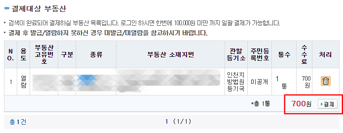 결제대상 부동산 주소 확인 후 결제 진행합니다.