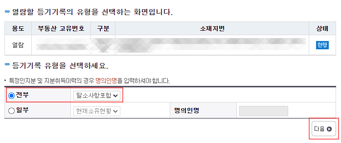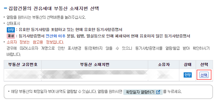 검색 소재지 및 소유자 이름이 검색 됩니다. 맞는지 확인 후 선택합니다.