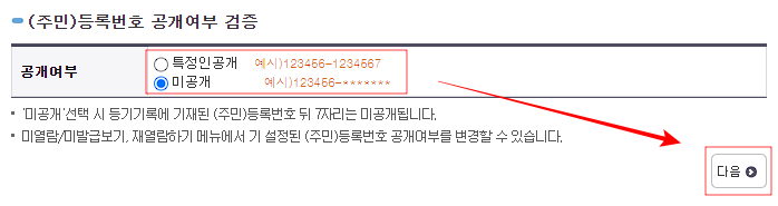 주민등록번호 공개여부 검증 선택 후 다음 ~
