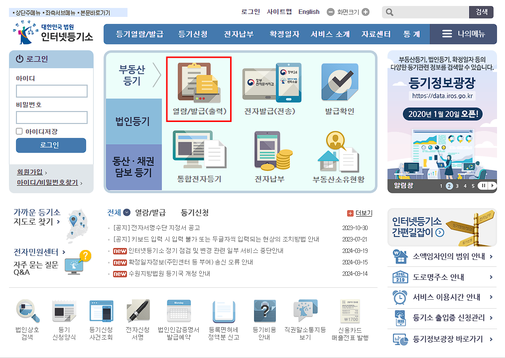 등기소 사이트로 접속해서 부동산 등기에 열람/발급(출력) 클릭합니다.