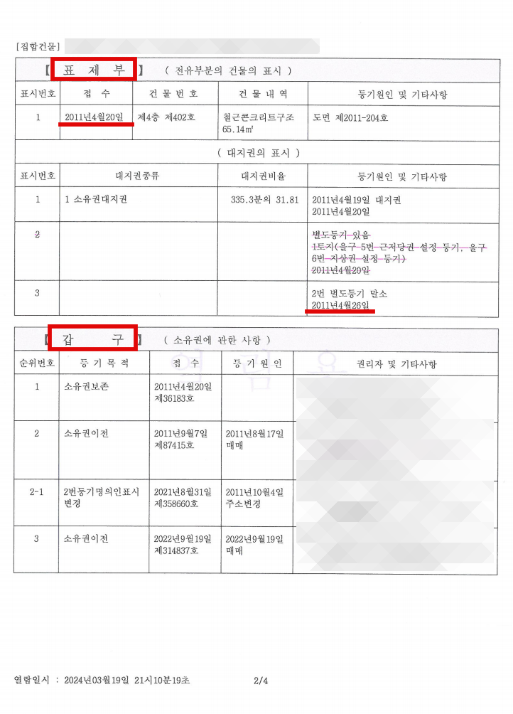 갑구 : 과거 소유주, 현재 소유주가 누구인지 부동산에 대한 소유권에 대한 정보를 제공.