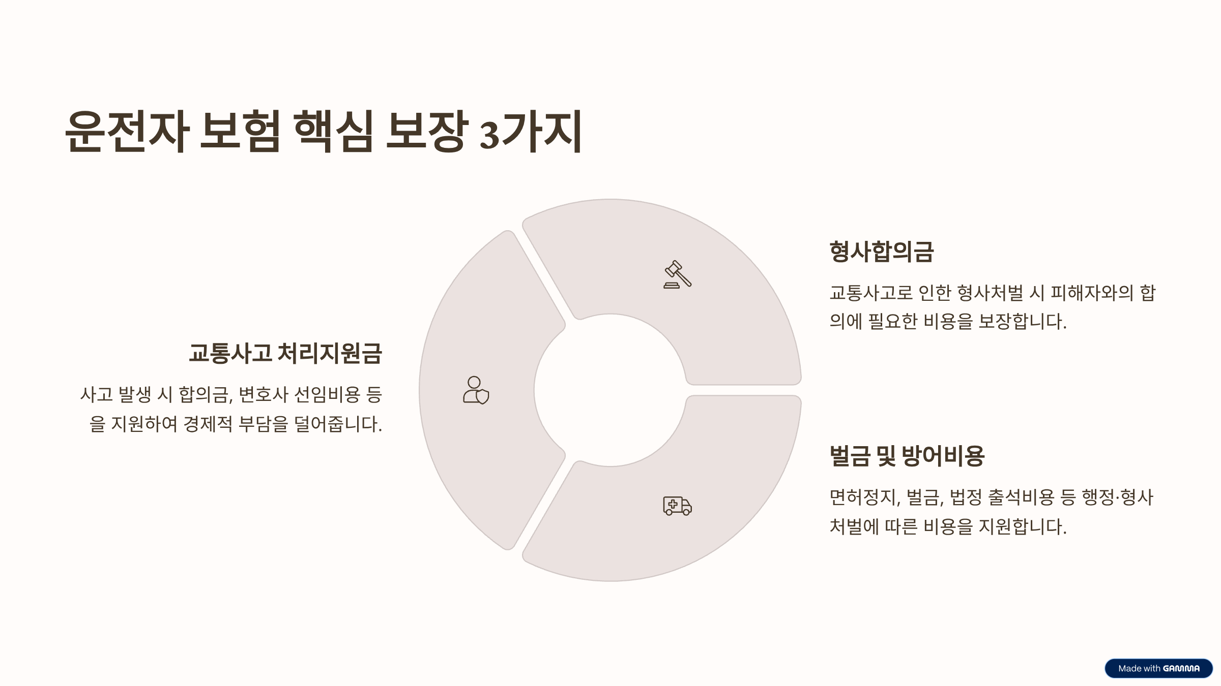 운전자 보험에는 여러 특약이 있지만, 절대 놓쳐서는 안 될 가장 중요한 3가지 핵심 보장이 있어요. 바로 '교통사고처리지원금', '벌금', '변호사 선임비용'이랍니다.