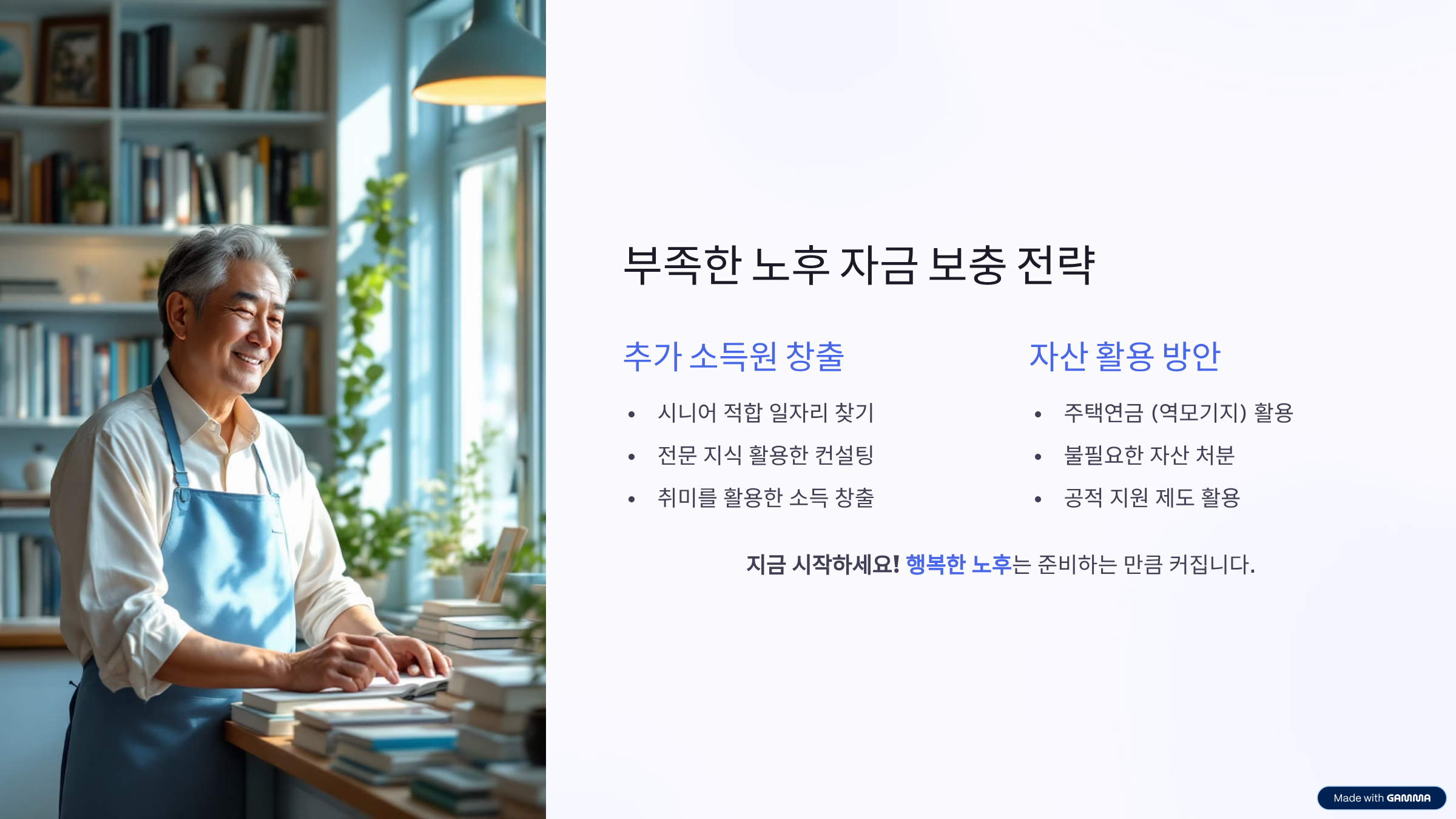 노후에도 가능한 부업이나 프리랜서 활동을 통해 소득을 유지합니다.