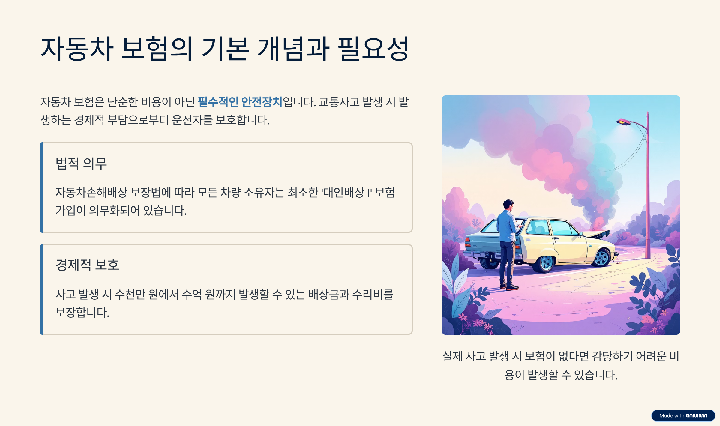 자동차 보험은 단순히 의무로 가입하는 게 아니라, 실제 사고 상황에서 얼마나 든든하게 보장받을 수 있는지가 핵심이에요. 그래서 어떤 보험을 선택하느냐에 따라 같은 돈을 내고도 보장 혜택은 크게 달라질 수 있답니다.